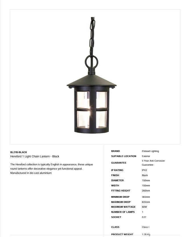 Hereford 1 Light Chain Lantern – Schwarz