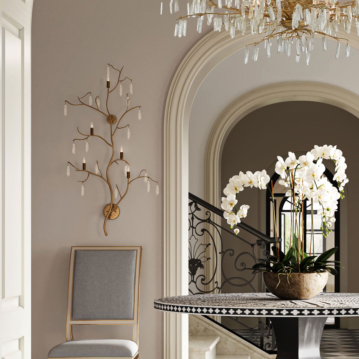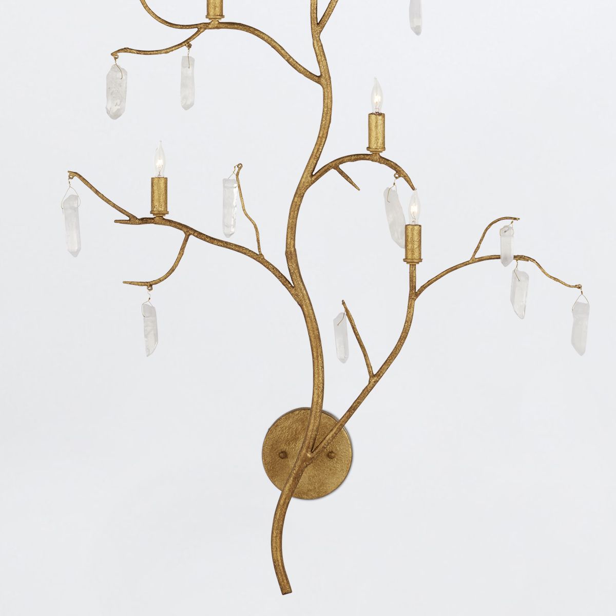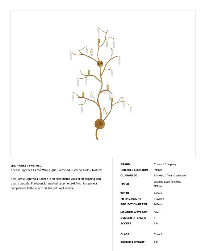 Die Forest Light Wall Sconce ist ein außergewöhnliches Kunstwerk, das mit Quarzkristallen trieft. Das wunderschöne gewaschene Luzern-Goldfinish ergänzt perfekt den Quarz dieser goldenen Wandwandleuchte.