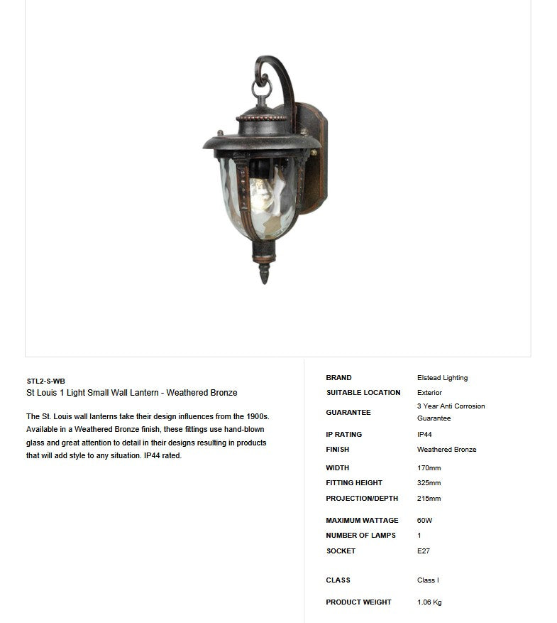 Die St. Louis Wandlaternen nehmen ihre Design-Einflüsse aus den 1900er Jahren. Diese Fähnchen sind in einem Wettervorhersagen-Bronze-Finish erhältlich und verwenden handgeblasenes Glas und viel Liebe zum Detail in ihren Designs, was zu Produkten führt, die jeder Situation Stil verleihen. IP44 bewertet.