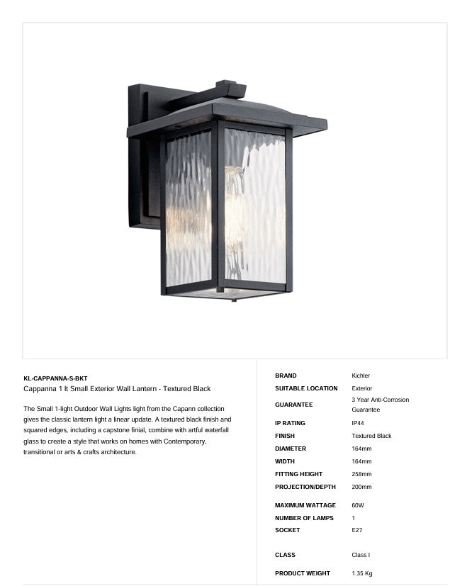 Die kleine 1-flammige Außenwandleuchte aus der Capann-Kollektion verleiht der klassischen Laternenleuchte ein geradliniges Update. Ein strukturiertes schwarzes Finish und quadratische Kanten, einschließlich einer Decksteinspitze, verbinden sich mit kunstvollem Wasserfallglas zu einem Stil, der zu Häusern mit zeitgenössischer, Übergangs- oder Kunsthandwerksarchitektur passt.