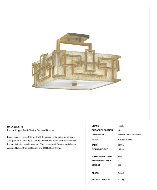 Lanza setzt mit seiner starken, rechteckigen Metallarbeit ein schickes Statement. Die geometrischen Details werden durch Leinentöne und Acrylgläser für einen raffinierten, modernen Look aufgelockert. Der Lanza Semi-Flush ist in den Farben Antiknickel, gebürstete Bronze und ölgeriebene Bronze erhältlich.