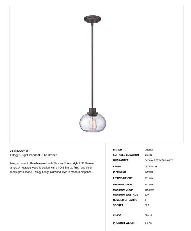 Trilogy wird zum Leben erweckt, wenn es mit LED-Glühlampen im Thomas Edison-Stil verwendet wird. Ein nostalgisches und dennoch schickes Design mit einem Old Bronze-Finish und einem klaren, zwielichtigen Glasschirm, Trilogy bringt den Stil der alten Welt in moderne Eleganz.